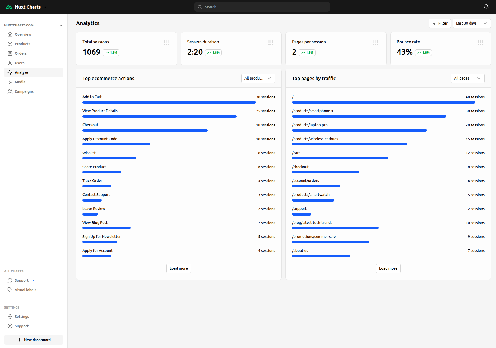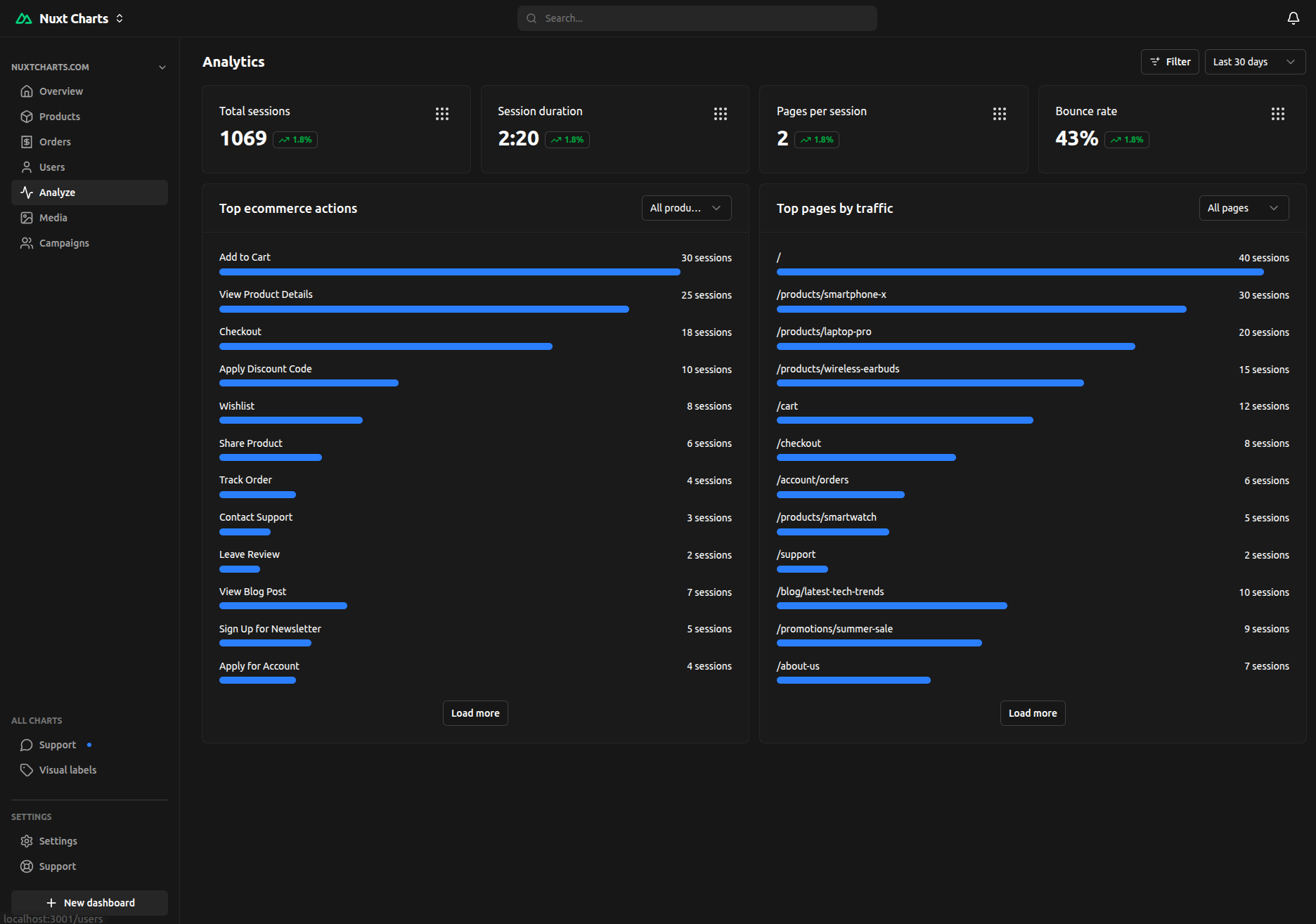 The Nuxt charts and dashboards are a breeze to use, it's so easy to implement them into my projects I can spend time on other things because I know I'll always have beautiful components at my disposal!